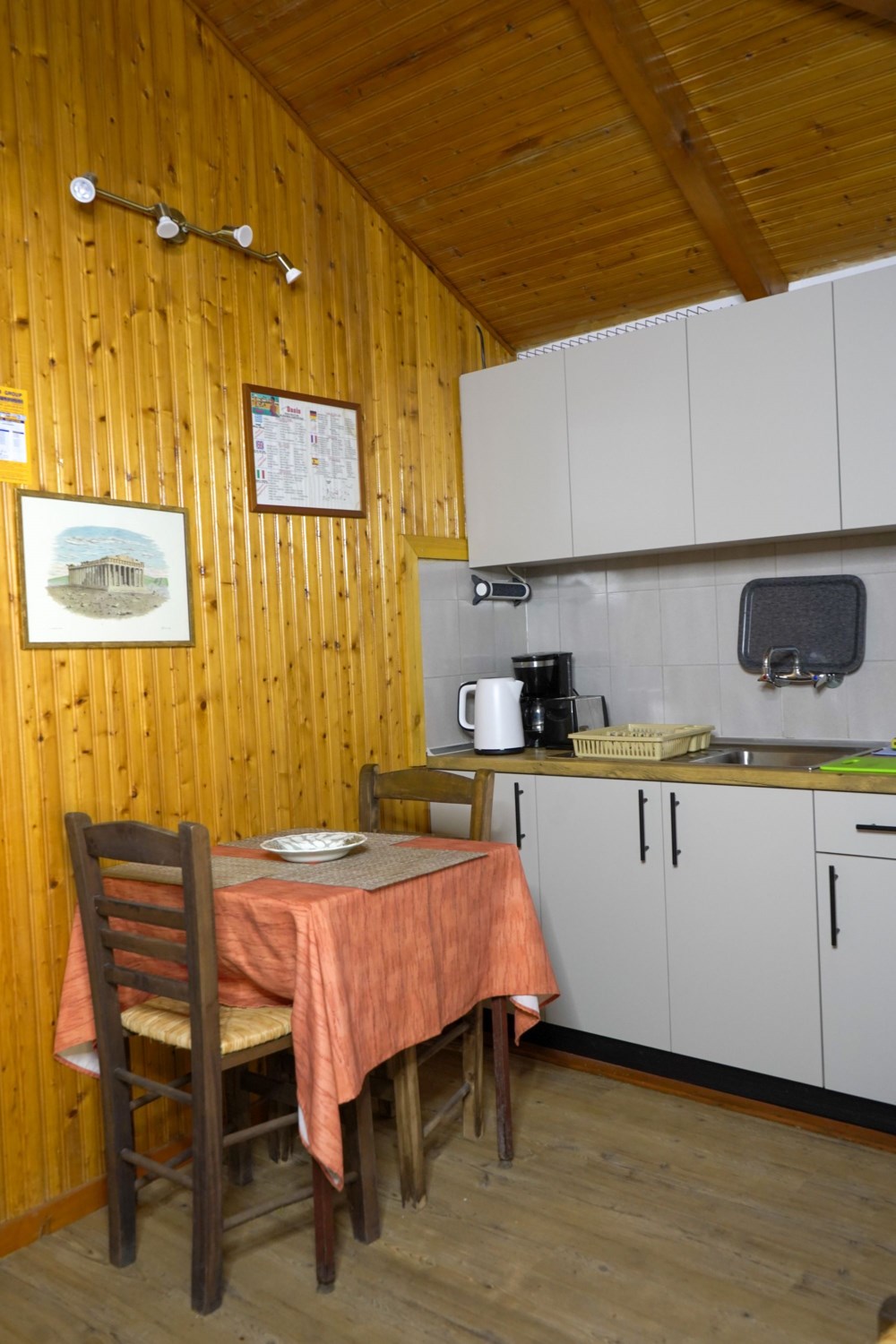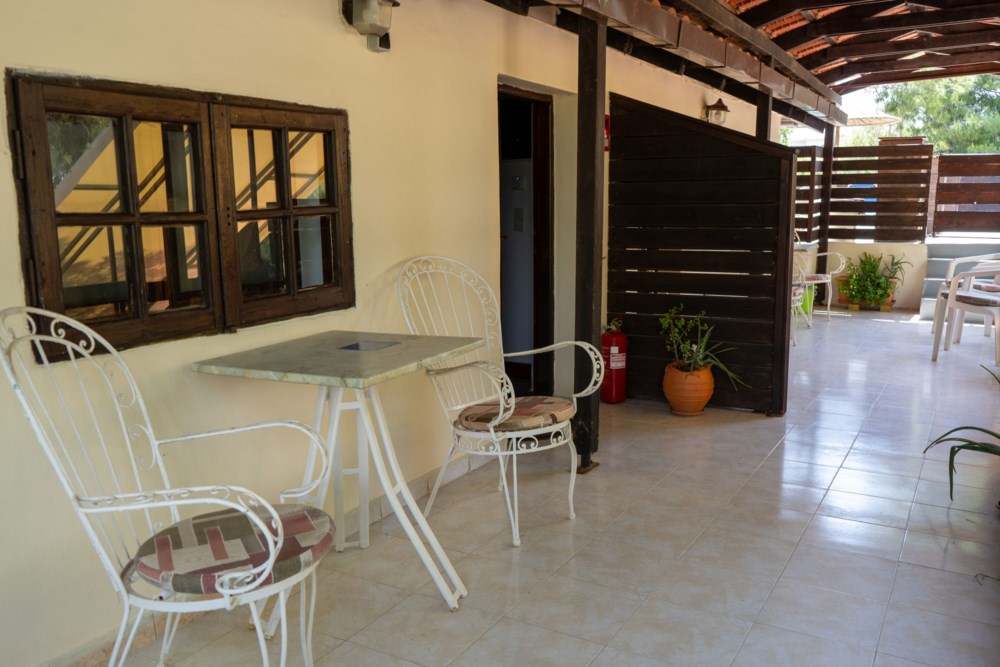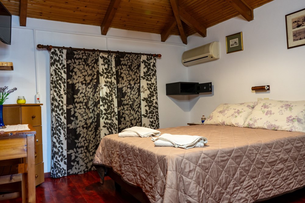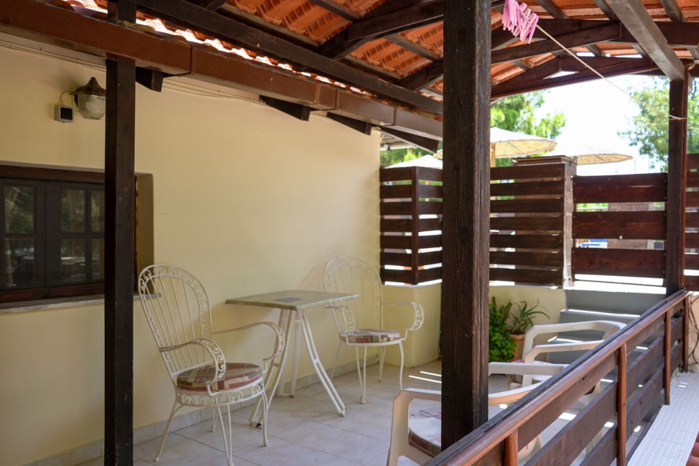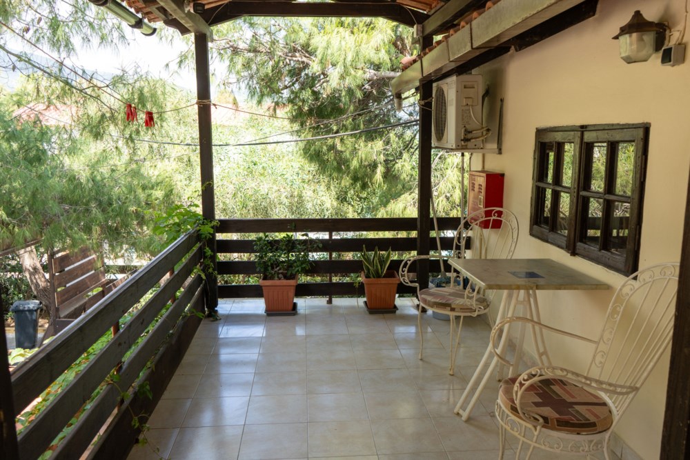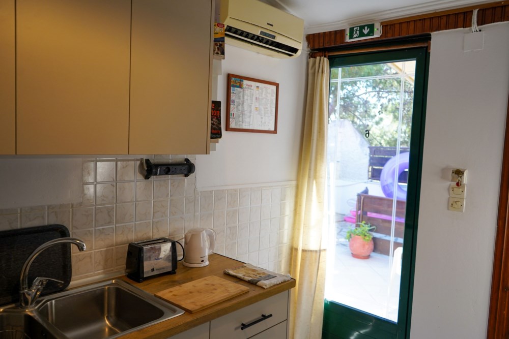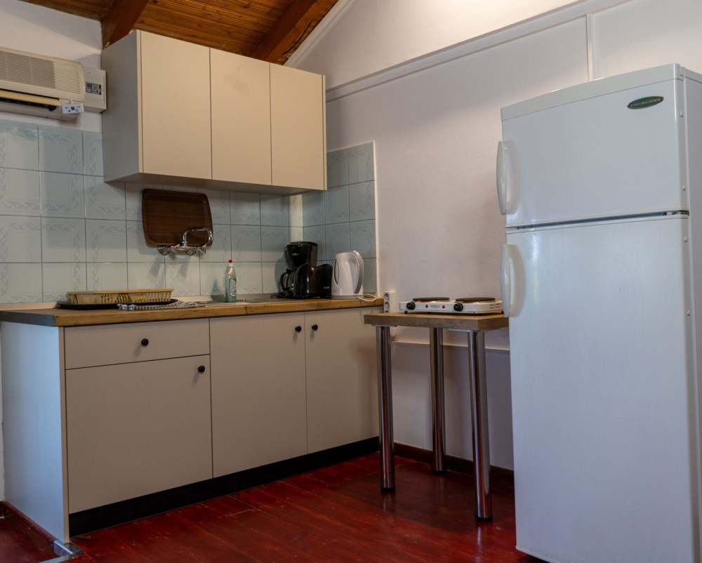 Also located on the first floor, Studio No. 3 is a 1 bedroom apartment. It features a bedroom with a queen-sized bed, two single beds in the kitchen, a bathroom with a shower, a fully equipped kitchen (refrigerator, 2 kitchen stoves, kettle, toaster, utensils, cutlery), a dining table, TV, air-conditioning, WiFi access, as well as a furnished veranda with a view of the surrounding area. Studio No. 3 can accommodate up to 4 guests, and a baby cot can be added upon request.